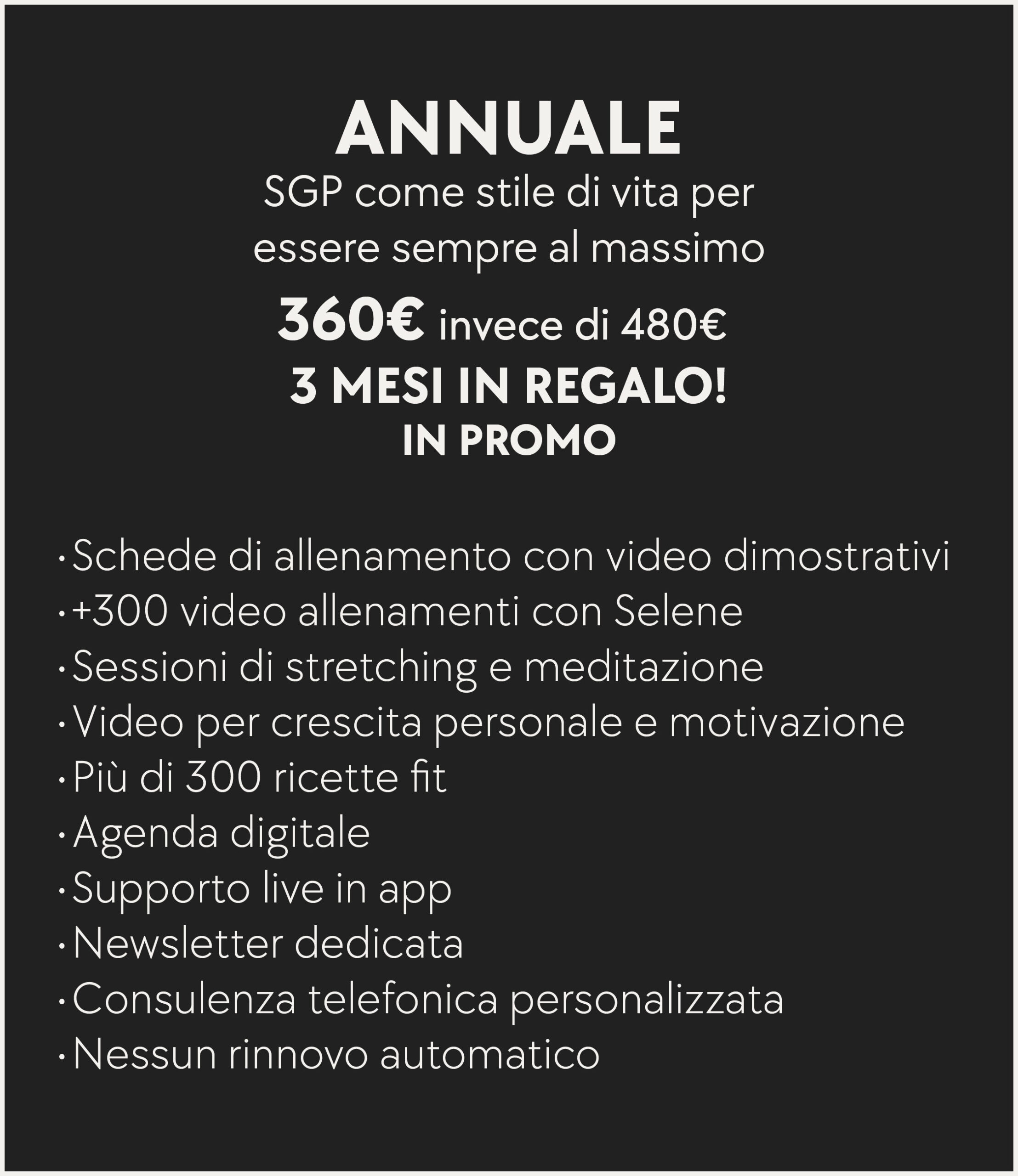 All’interno di SGP puoi scegliere liberamente l’allenamento che preferisci in quel momento: una scheda o un video workout. Sono tutti completi, total body e pensati per lavorare il corpo in modo armonico.