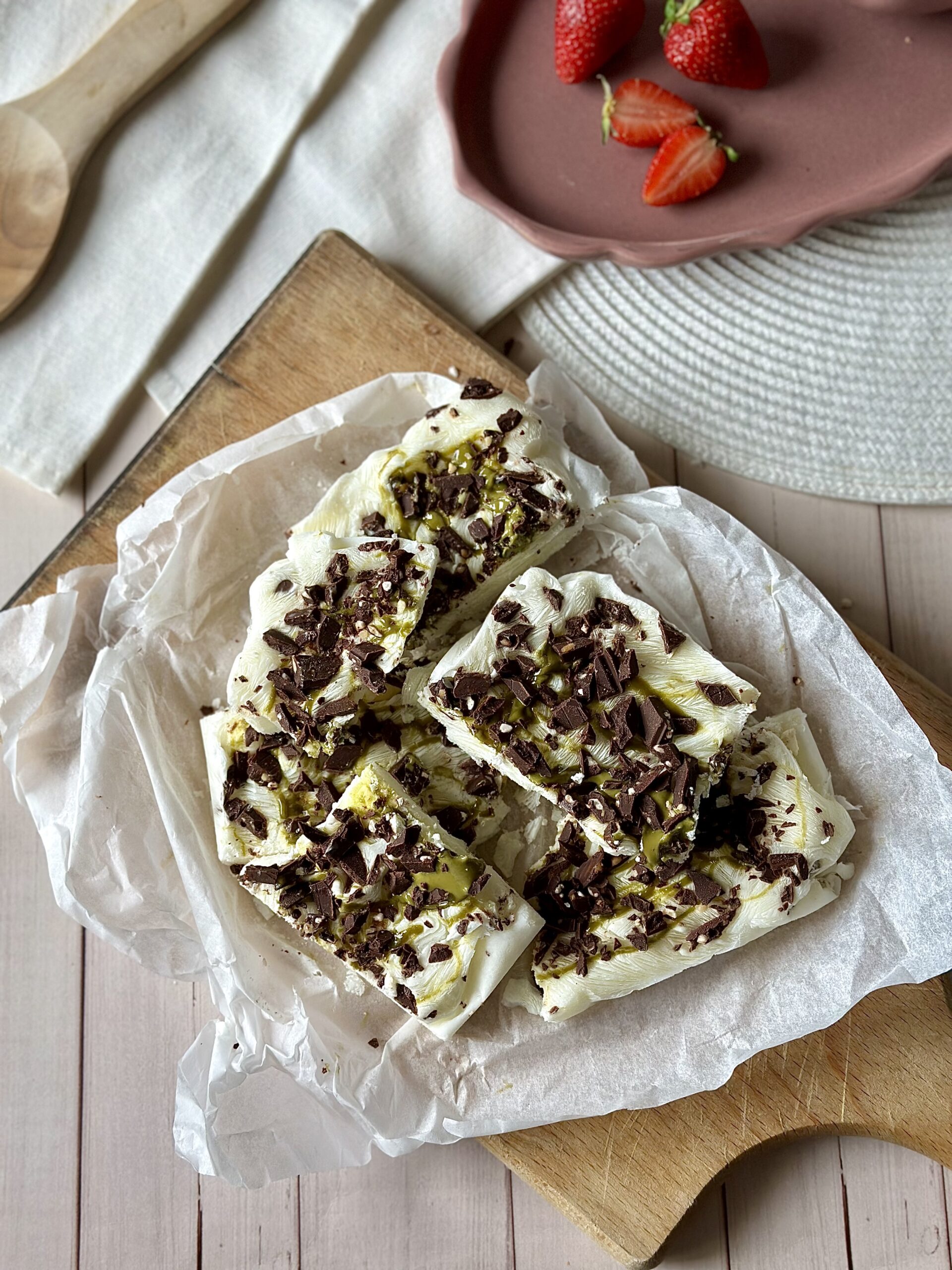 7. Lascia raffreddare completamente, poi sciogli il cioccolato fondente a bagnomaria e stendilo sopra la base;