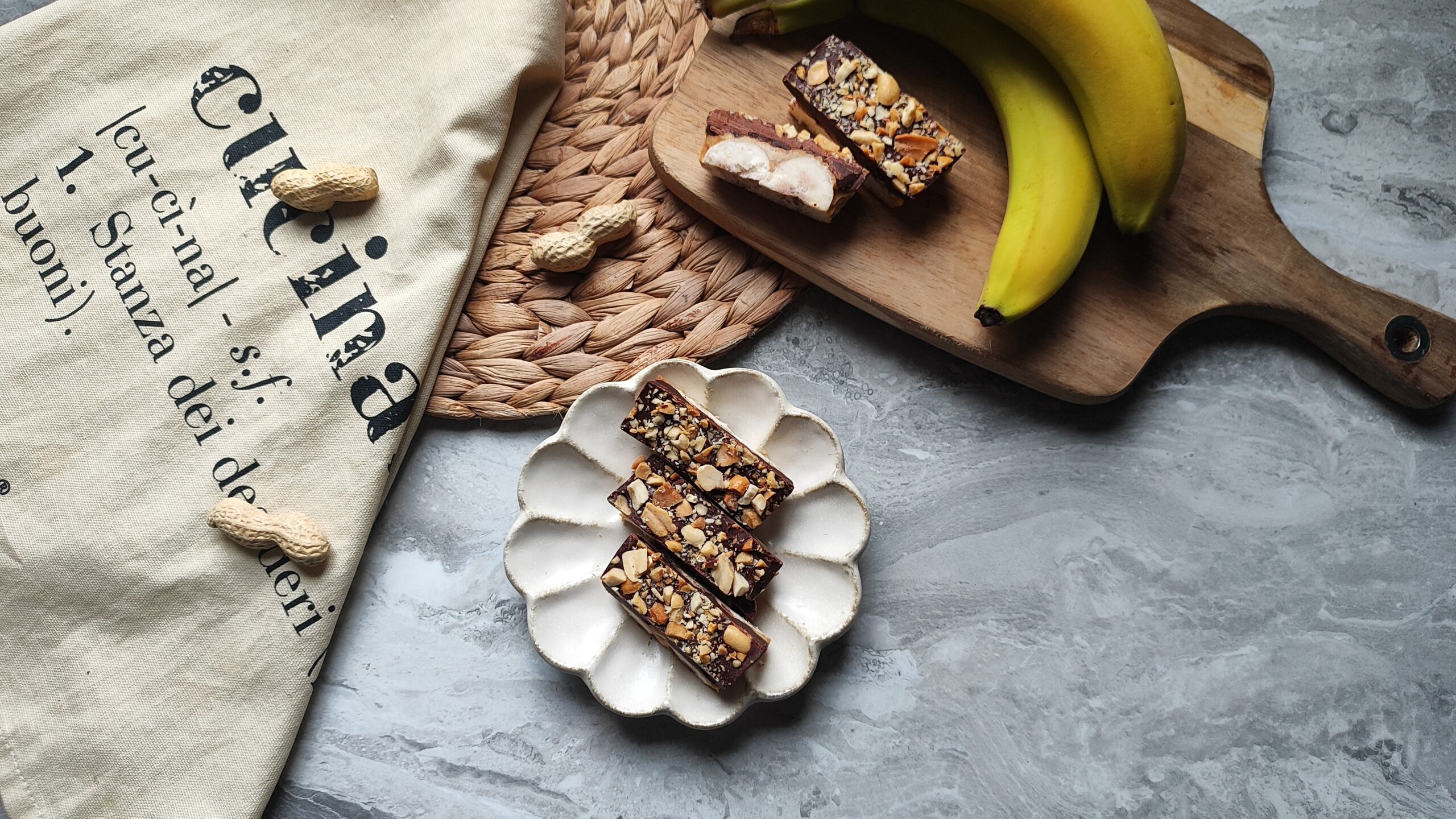 Le barrette ai cereali e cioccolato create da Giulia, sono uno snack energetico, sano e irresistibilmente croccante. Prepararle in casa è semplicissimo: un mix di fiocchi integrali, semi e nocciole si unisce alla cremosità del burro di arachidi e alla nota aromatica di cannella e vaniglia, per poi essere ricoperto da uno strato di fondente che le rende ancora più golose.