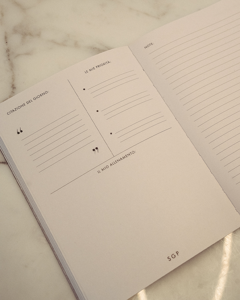 Il diario di SGP è stato progettato da me per essere un vero e proprio compagno all’interno della tua routine quotidiana. Nella prima pagina potrai appuntare ogni giorno le tue citazioni, le tue priorità, i tuoi allenamenti e i tuoi progressi. Nella seconda, la sezione note per lasciare liberi i tuoi pensieri.